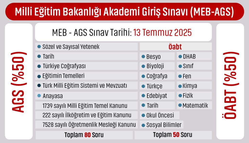 2025 MEB AGS kapsamında adaylara Akademi Giriş Sınavı’nda (AGS) toplam 80 soru yöneltilecek. Bu sınav, öğretmen adaylarının genel kültür ve genel yeteneklerini ölçmek üzere şu konuları kapsayacak: